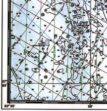 Secondly, there are those other lines that wander about diagonally without any reference to north or south. Also, they are in different colors. These "Lines of Position" are called LORAN-C. This part gets technical, but here we go anyway; when you have found or selected a place on the chart that you want to go to, you will select the same color "Lines of Position," then use dividers and the scale to determine the coordinate "Numbers" or for them old salts the Time Delays (TDs).